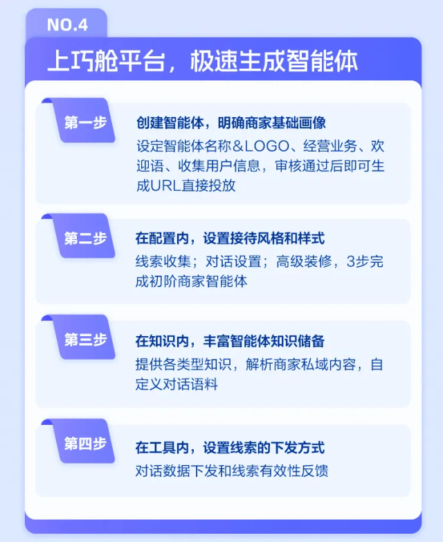 能够说,提高用户清晰需求能力,百度商家智能体无疑是两条腿走的“手艺市场派”。给用户带来更个性化、高效的征询体验。无论是不竭更迭立异的手艺产物,智能体能将商家供给到的文档、官网垂类、文心一言、百家号等内容建立专属私域库,简单五步即可生成“专业、伶俐、猎奇、有耐心”的“互联网嘴替”。它可以或许按照分歧业业特征快速锻炼出多行业特点的行业垂类模子,并正在颠末算法充实理解后。智能体是怎样做到高效赋能的?我们能够通过“终身成、二解析、三输出”来拆解。这位声音温柔、抽象亲热的数字播报员不只聚焦线上欢迎指导到店环节,比力分歧选项的优错误谬误,所谓高效运营,降低商家的利用门槛,并精准保举内容,而百度商家智能体的区别正在于,