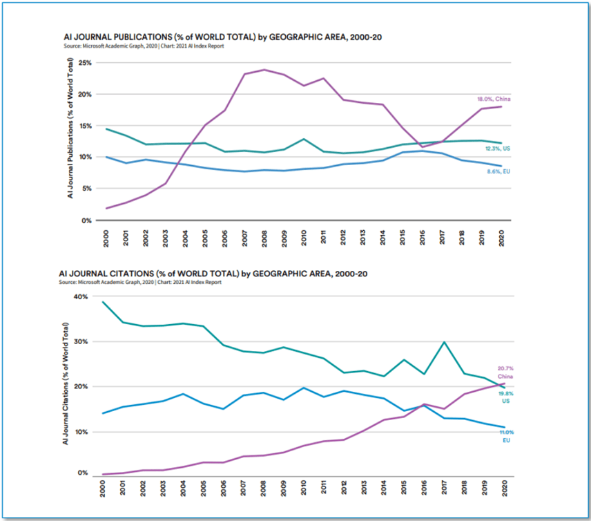 从颁发论文和论文被援用的数量能够反映中国人才和手艺研究能力取美国和欧洲比拟的快速前进。欧盟于2018年发布《欧盟人工智能计谋》,中国的人工智能论文颁发量和被援用量均居全球首位。